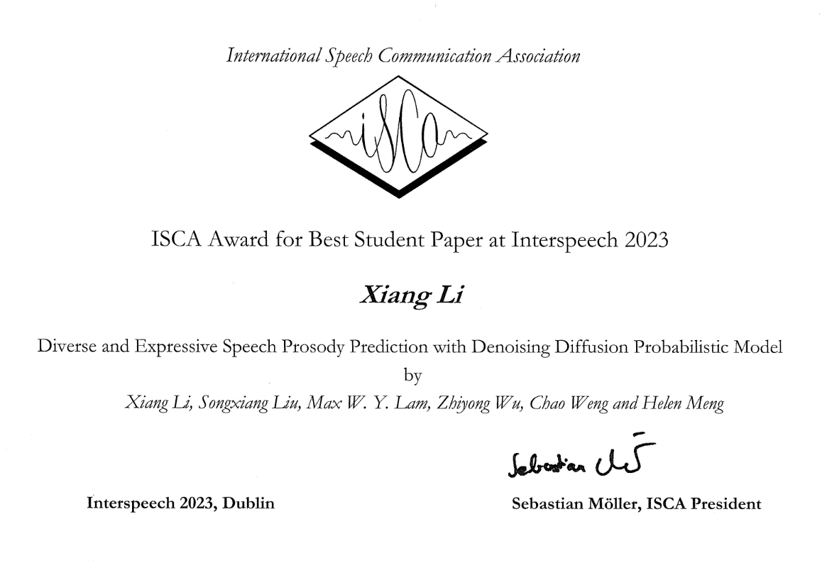 表现力语音合成自动风格控制方面的研究成果,近日以“基于去噪扩散概率模型的多样化高表现力语音韵律预测”(Diverse and Expressive Speech Prosody Prediction with Denoising Diffusion Probabilistic Model)为题,被“国际语音通讯学会2023年会”(The 24th Annual Conference of the International Speech Communication Association) 录用,并获得最佳学生论文奖。