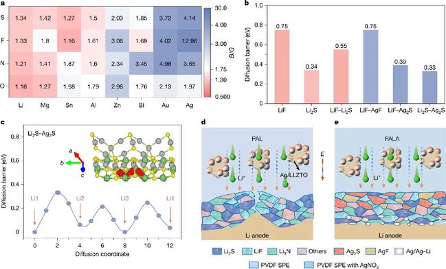 研究团队从SEI结构和模型进行源头创新,摒弃传统SEI“唯强度论”的结构模型和设计理念,将“塑性”特征作为新型SEI组分筛选的核心指标,以Pugh准则为塑性判据(B/G比值≥1.75表明组分具有塑性,其中B为体模量,G为剪切模量),通过对一系列潜在无机物进行了人工智能加速的理论筛选,发现硫化银、氟化银等材料不仅具备良好的塑性变形能力,还能显著降低锂离子的扩散能垒。