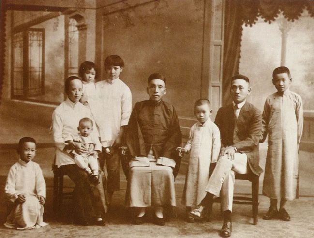 周诒春全家合影。从左至右为:周佑康(次子),胡怡爱(夫人),周耀康(四子),周珊凤(次女),周丹凤(长女),周聿修(父亲),周华康(三子),周诒春,周寿康(长子)