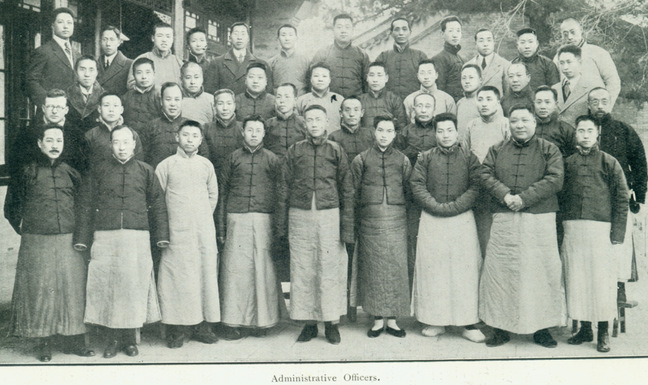 1916年,周诒春与清华职员合影。前排中立者(左5)为周诒春,左1为副校长赵国材,右2为斋务长唐孟伦,右1为文案吴宓