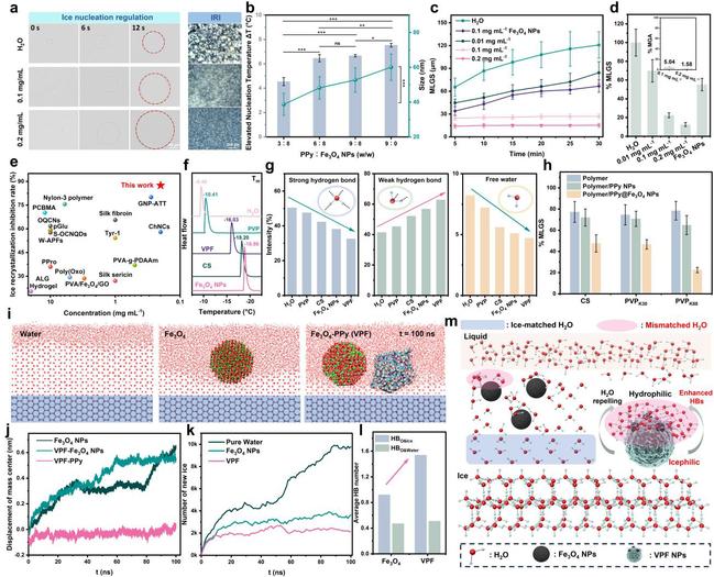 研究中构筑的Janus材料由磁性Fe3O4 NPs与光热PPy不对称组合而成,形成一个类似雪人的头部–躯体结构。这一结构在冰–水界面表现出极强的“水化–去匹配”双调控效应:Fe3O4 NPs通过强水合作用破坏局部氢键网络,削弱自由水分子与冰界面的匹配;PPy“躯体”与冰晶表面贴合形成微曲界面,通过Gibbs-Thomson效应抑制重结晶,并驱动水分子由冰界面转移至亲水头部。分子动力学模拟进一步揭示了这种Janus构型在冰-水界面的协同抑冰机制,使冰晶平均面积减少高达98.4%(图2)。