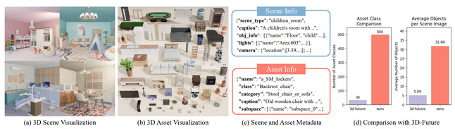 研究使用图像生成模型Flux将用户的输入提示扩展为引导图像,通过高质量3D场景布局数据进行微调,Flux能够生成质量更高且与资产集合风格更一致的图像,这将显著提高了摆放系统的可控性;接着构建一个基于预训练视觉模型的图像分析模块,融合视觉语义分割、单图像几何解析以及基于图的场景图逻辑构建功能;团队再根据语义特征匹配策略,从资产集合中检索出与引导图像最匹配的对象,结合视觉语义特征、几何信息和场景布局逻辑,迭代计算每个前景对象的旋转、平移和缩放变换。最终,团队通过场景图逻辑和图像语义解析对三维场景布局进行一致性优化,确保最终3D场景在视觉和逻辑上与引导图像相近。