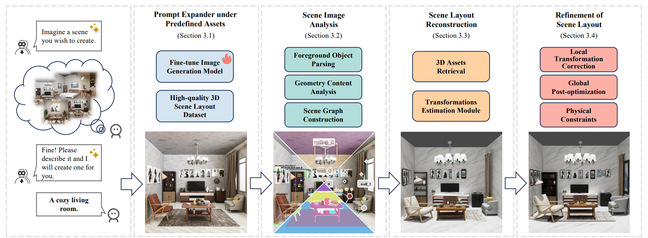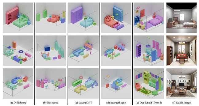 为此,清华大学深圳国际研究生院副教授曾龙课题组与合作者联合攻关,研究搭建一个3D场景布局系统(图2),能在给定某个高质量的3D资产库的情况下,从文本或图像输入下,即可生成自然、细致且逻辑连贯的3D场景布局。