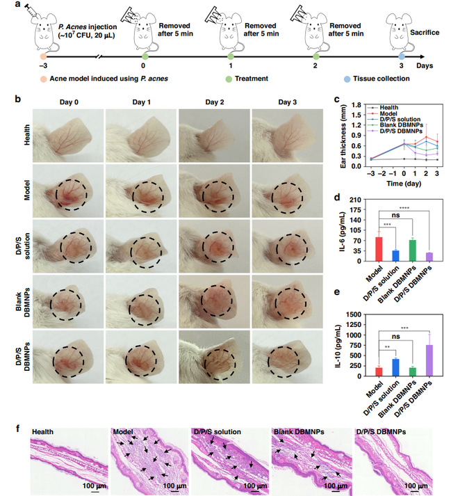 研究团队通过建立小鼠耳部痤疮模型,系统探究了其在痤疮治疗中的功效。实验结果表明,载药的DBMNPs显著优于传统外用药液组,其生物相容性良好,能够显著降低痤疮部位促炎因子IL-6,提升抑炎因子IL-10的表达,使用3天后几乎完全清了除病灶部位的痤疮丙酸杆菌,具有良好的痤疮治疗效果。