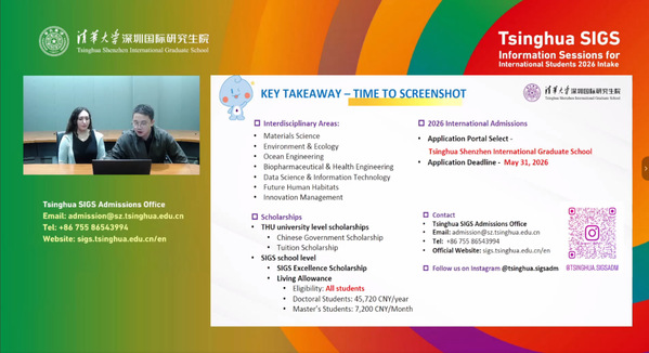 清华SIGS于2025 年 12 月 10 日参加亚洲大学联盟(Asian Universities Alliance,AUA)2025年在线教育展,面向全球学子成功举办研究生项目线上招生宣讲会。本次活动由学院招生办公室统筹,培养处副处长郭宇韬主讲,美国在读硕士生嘉迷(Maria Camila Copo Amador)主持。