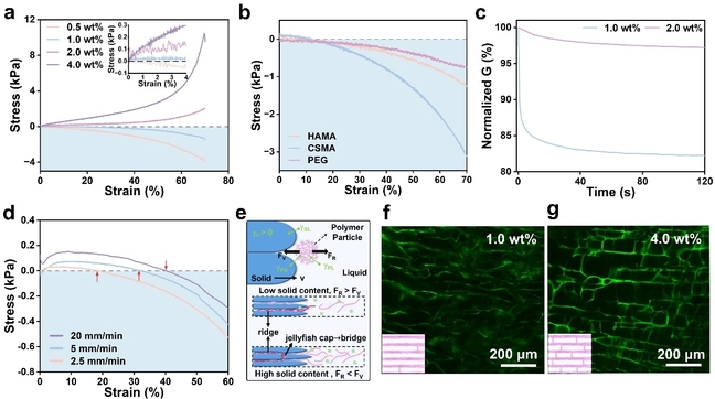 研究团队采用正交温度梯度下的定向冷冻策略,使胶原蛋白在冰晶生长过程中发生富集与重排,形成由层状通道和层间桥接构成的各向异性骨架(图2)。与常规均质水凝胶不同,F-gel在受压时并非产生力学抵抗,而是表现出沿加载方向的反常收缩行为,即负应力响应。实验结果表明,低固含量的F-gel负应力最大值可达−27.77 kPa,随着固含量升高,可以转变为常规正应力。这种力学行为的“开关”转换,源于材料内部独特的层间桥结构以及水合状态的动态变化,从而实现对力学信号方向与幅值的可编程调节(图3)。