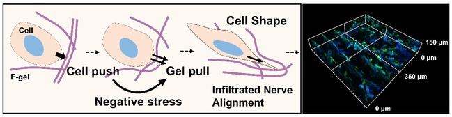 针对这一难题,清华大学深圳国际研究生院助理教授耿洪亚团队基于在低温生物工程和控冰技术方面的积累,开发了一种具有仿生天然细胞外基质的“负应力”效应的胶原蛋白水凝胶(F-gel),该材料能在外力压缩时,沿加载方向产生主动的牵引力(负应力),而非传统材料被动的抗压阻力(正应力),从而成功模拟天然ECM的牵引力信号,显著促进了神经细胞定向排列与深度浸润(图1)。