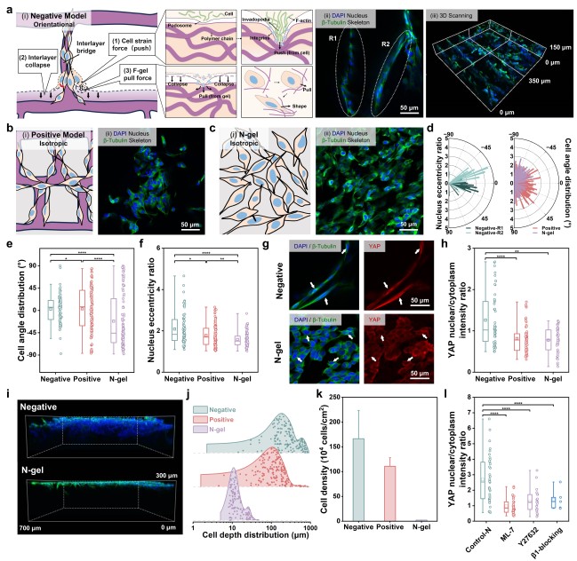 研究团队以人神经母细胞瘤细胞(SH-SY5Y)为模型进行了概念验证。实验证明,负应力能有效引导细胞定向排列,并促进其向材料内部深层浸润。F-gel中细胞的平均浸润深度达到336.30微米,是传统均质水凝胶的21.6倍,细胞增殖密度提升了76.7倍。机制研究表明,负应力效应依赖整合素介导的黏附与ROCK信号通路,并伴随YAP/TAZ的核转位,提示负应力可有效激活细胞机械转导过程。