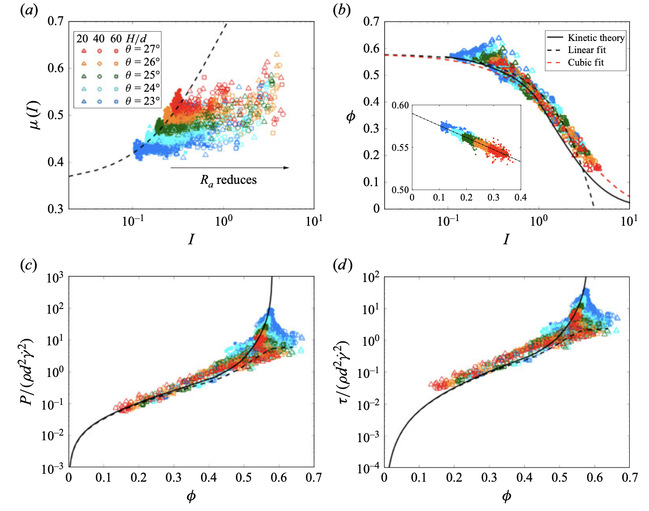 为了更好地预测斜面颗粒流的运动速度,研究团队细致刻画了颗粒流底部边界层的流场分布和壁面滑移速度,建立了能够考虑任意边界粗糙度的修正拜格诺公式及速度滑移律。同时,团队对颗粒动理学理论(kinetic theory)中的若干速度边界条件模型进行了测试,发现既有理论模型仅能一定程度上还原颗粒流边界层滑移现象,其定量预测仍远远无法满足需求。