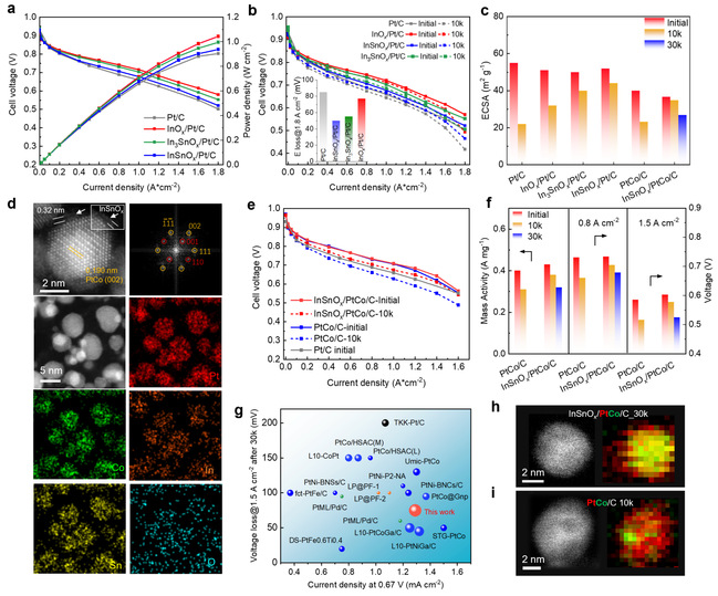 图5. MOx/Pt/C和MOx/PtCo/C催化剂的膜电极性能测试及结构表征