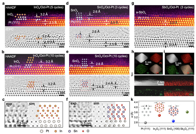 图2. Pt(111)表面与超薄MOx(M=In、Sn、Sb)的界面构筑与原子尺度表征