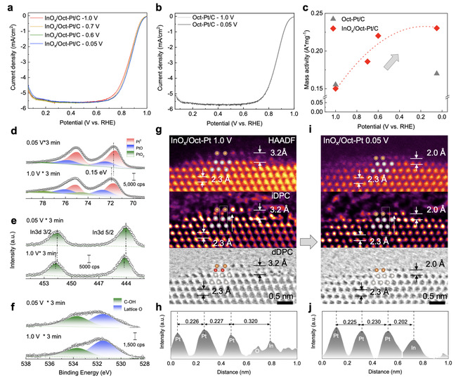 本研究提出了一种动态金属-氧化物界面(MOx/Pt, M = In、Sn、Sb)调控策略,并将其应用于多种燃料电池铂基催化剂体系,包括Pt八面体纳米颗粒(Oct-Pt)及高比表面积的Pt/PtCo合金催化剂,实现了ORR活性与稳定性的协同提升。结合干林课题组的差分相位衬度扫描透射电子显微成像(DPC-STEM)与Marc Ledendecker课题组原位流动池电感耦合等离子体质谱(ICP-MS)技术,研究团队在原子尺度上观察到富氧型M–O–Pt界面(高电位)与缺氧型M–Pt界面(低电位)之间的可逆转变机制。还原电位下(0.7 V以下),M–Pt界面通过界面电荷转移显著提升ORR活性(Pt-InOx体系效果最为显著);氧化电位下(1.0 V及以上),O原子插入M–Pt界面之间形成M–O–Pt界面,有效抑制了Pt的氧化、溶解与迁移,提升催化剂的耐久性。研究进一步采用InSnOx修饰的PtCo催化剂,在车用质子交换膜燃料电池条件下实现了电池稳定性相比于PtCo催化剂提升三倍的成果。该工作提出了通过构筑金属-氧化物动态界面解耦催化活性-稳定性权衡的新范式,为开发高性能、长寿命燃料电池催化剂开辟了新途径。