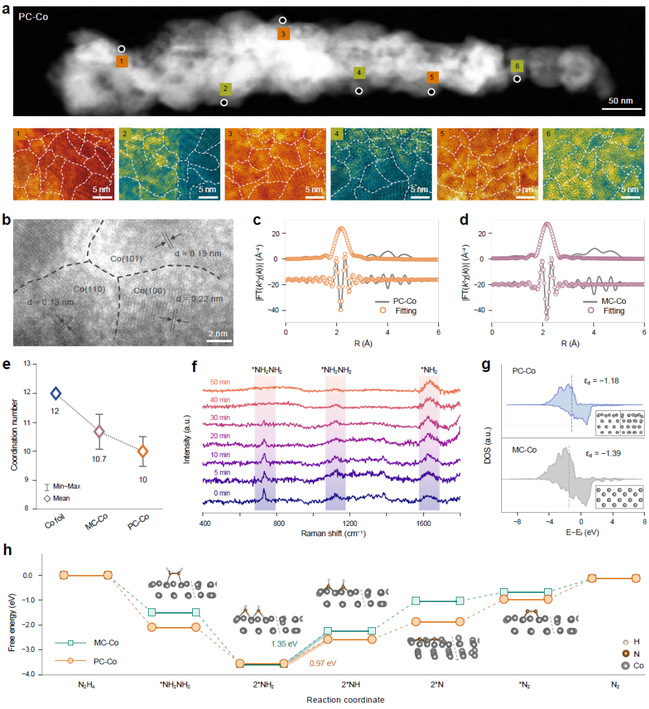 此外,研究以 PC-Co 和 MC-Co 催化剂作为范例用于肼氧化反应(HzOR),阐明了晶体周期性与催化活性之间的关系。实验与计算综合表明,PC-Co 的配位数比 MC-Co 更小,从而使得d带中心上移,增强了中间体NH*的吸附,促进反应子步骤的吉布斯自由能垒的均匀化。结果,PC-Co 催化剂表现出快速的催化动力学,其塔菲尔斜率低至14 mV dec−1,并在100 mA cm−2下表现出 120 小时的优异稳定性。为了进一步展示其应用潜力,组装了HzOR耦合的新型锌空气电池。得益于肼废水的化学能转化,该电池在 10 mA cm−2的电流密度下实现了高达 193%的电能效率(传统锌空气电池仅为64%),并且稳定运行了 1200 小时。以回收废旧钴酸锂正极作为钴源合成的PC-Co催化剂,相较于商业钴源,成本降低了75.2%。