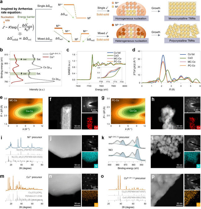 过渡金属纳米晶体(TMNs)被广泛应用于诸多催化反应。其中,具有高度有序原子排列的单晶TMNs通常作为模型催化剂用于基础电催化机制的研究,而具有大量晶界的多晶TMNs则常用于揭示催化反应中缺陷与活性的关系。目前已报道的合成单/多晶TMNs(MC/PC-TMNs)的方法均依赖外部实验参数(如浓度和温度等)的精确调控,制备过程复杂且耗时。此外,制备单/多晶结构所需的临界参数值往往难以确定,导致形态难以控制。因此,开发一种依赖于材料本征参数而非实验参数的方法来实现MC/PC-TMNs的简易合成是一个重大挑战。但是,基于液相经典成核理论,实现本征参数调控合成MC/PC-TMNs几乎是不可行的,而固相成核的规律仍有待探索。