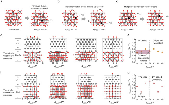 研究结合DFT理论计算进一步阐明合成机理。固相还原和成核过程大致遵循以下步骤:高价金属的还原和氧空位的形成,空位扩散或零价金属的迁移和聚集,以及晶体核的形成。在兼具四面体配位的Co2+和八面体配位的Co3+的Co3O4中,Co2+将优先断开所有的Co–O键,局部氧空位积累,从而促进局部金属化和迁移。这为多晶混合价前驱体中的空间非均匀成核提供了机制基础。接着,计算还原的Co0晶核与未还原的氧化物前驱体之间的界面形成能γ,分析其对晶体生长周期性的影响机制。对于混合价态的前驱体,γ在界面旋转角度为 0°、15°和 45°时呈现出几个近乎重叠的最小值,这表明其取向锚定作用较弱,从而倾向于形成多晶。而对于单一价态的前驱体,γ在界面旋转角度为 15°时呈现出单一的最小值,这表明其锚定作用较强,更有利于形成单晶。
