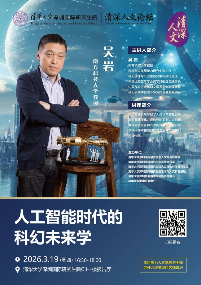 吴岩教授将从“科幻未来学”的理论框架出发,探讨:科幻文学如何从单纯的“幻想”发展为一种“未来研究方法论”?它如何帮助我们训练对未来的想象力、构建应对剧变的心理韧性?在AI重塑一切的时代,我们如何像科幻作家一样思考,提前“预演”可能的未来?本讲座将带领听众完成一次从文学到未来学、从想象到认知的思维跃迁。
