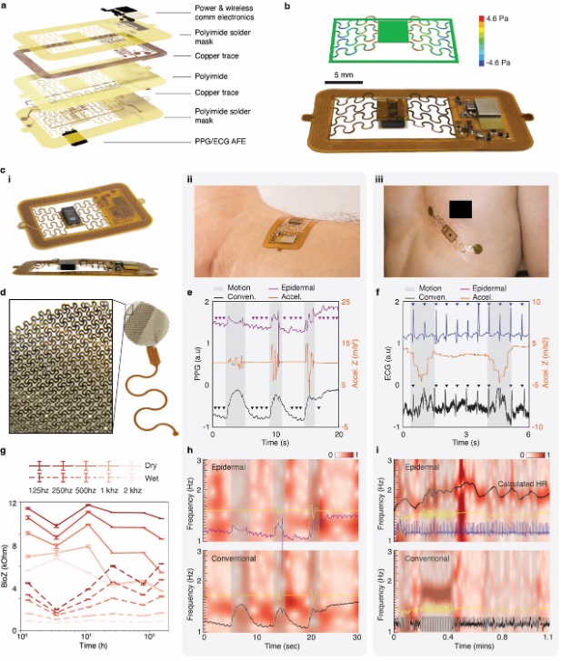 在传感器方面,研究团队设计了一系列无线无源的表皮电子传感器,构建了由心电(ECG)与光电容积脉搏波(PPG)传感器组成的系统。该系统采用无电池的柔性贴肤设计,可在运动状态下减少运动伪影、实现稳定信号采集,并兼具良好的佩戴舒适性与长期使用能力。