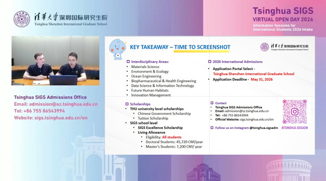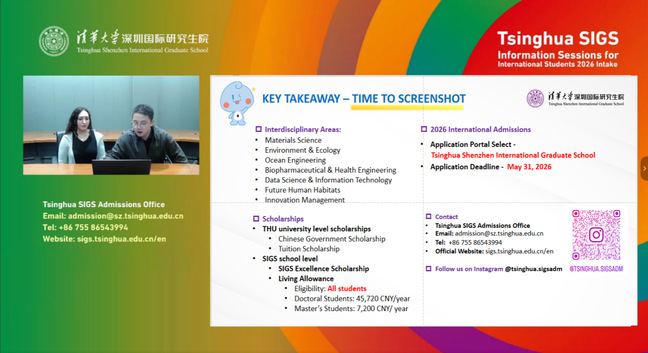12月5日,我院举办2026年国际研究生线上开放日。本次活动由招生办公室主办,各教学科研机构参加,旨在面向全球宣传我院的国际研究生招生项目。开放日活动由我院格鲁吉亚籍留学生、2021级精准医学与公共健康专业博士生大卫(Davit Khutsishvili)主持。培养处副处长郭宇韬为开放日活动致辞,全面介绍了我院学位项目、短期访学项目,欢迎同学们积极报考清华SIGS。大卫分享了在院学习、科研和生活的体验。数据与信息研究院董宇涵、材...