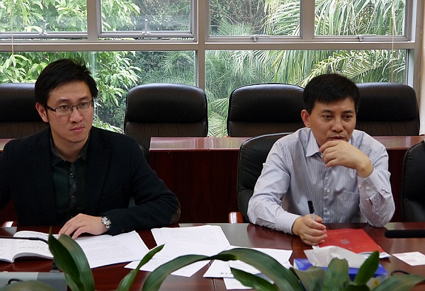 图为深圳市公园管理中心主任田学根(右一)、公园规划发展室副主任朱毅(左一)与记者团同学们座谈