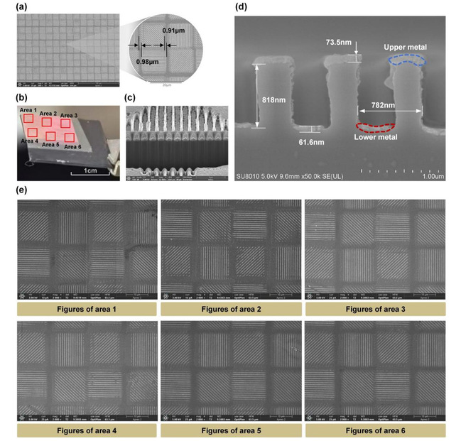 研究团队使用有限差分时域,分析模拟了间隙大小及间隙填充介质对干涉条纹的作用,选用折射率匹配材料对间隙进行填充,抑制掩膜与基底间隙造成的干涉条纹质量下降。同时,研究团队构建了基于显微成像技术的亚微米级精度对准观察平台,使用掩膜板上的双区域周期性条纹标记,实现掩膜与基底顶点的对准,成功实现了分步光刻套刻对准,避免了不同线栅区域的串扰。