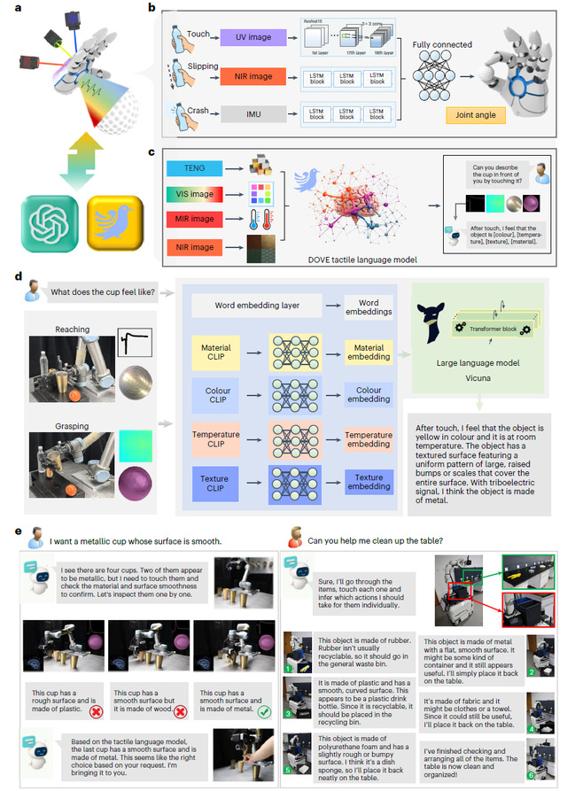 为了充分挖掘传感器的多模态感知潜力,团队还自主构建了拥有8.5亿参数的触觉语言模型DOVE,能够理解丰富的触觉信息,赋予机器人类人触觉感知和环境理解能力(图4)。目前,SuperTac (图5)已成功集成至机器人灵巧手中(图6),支持远程实时状态反馈,有望在制造、医疗、服务机器人等领域发挥变革性作用。