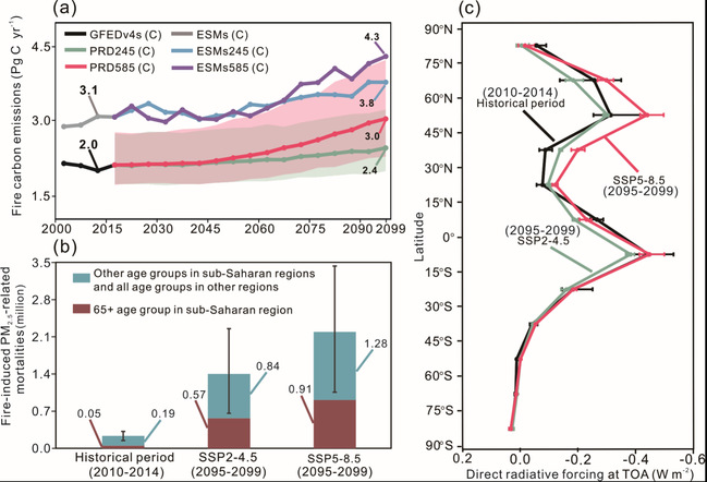 Figure 1. Historical changes and future projections of wildfire emissions and their impacts on PM₂.₅-related health effects and direct radiative forcing