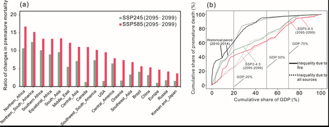 The study finds that, as climate warming and drought conditions intensify, global wildfire activity will significantly increase in the future. Under the medium emission scenario (SSP2-4.5), global wildfire carbon emissions are projected to rise by approximately 23% by the end of the century compared to current levels. Additionally, an estimated 1.4 million premature deaths per year worldwide will be attributable to PM2.5 exposure from wildfire smoke—six times the current death toll of about 230,000 (Figure 1). Under the SSP2-4.5 scenario, Africa is projected to experience an 11-fold increase in premature deaths due to wildfire PM₂.₅ exposure by the end of the century, while mid-latitude regions of the Northern Hemisphere, including Europe and North America, will see a 1–2 fold increase (Figure 2). These results underscore the severe threat posed by growing wildfire risk to global public health and its uneven regional distribution.