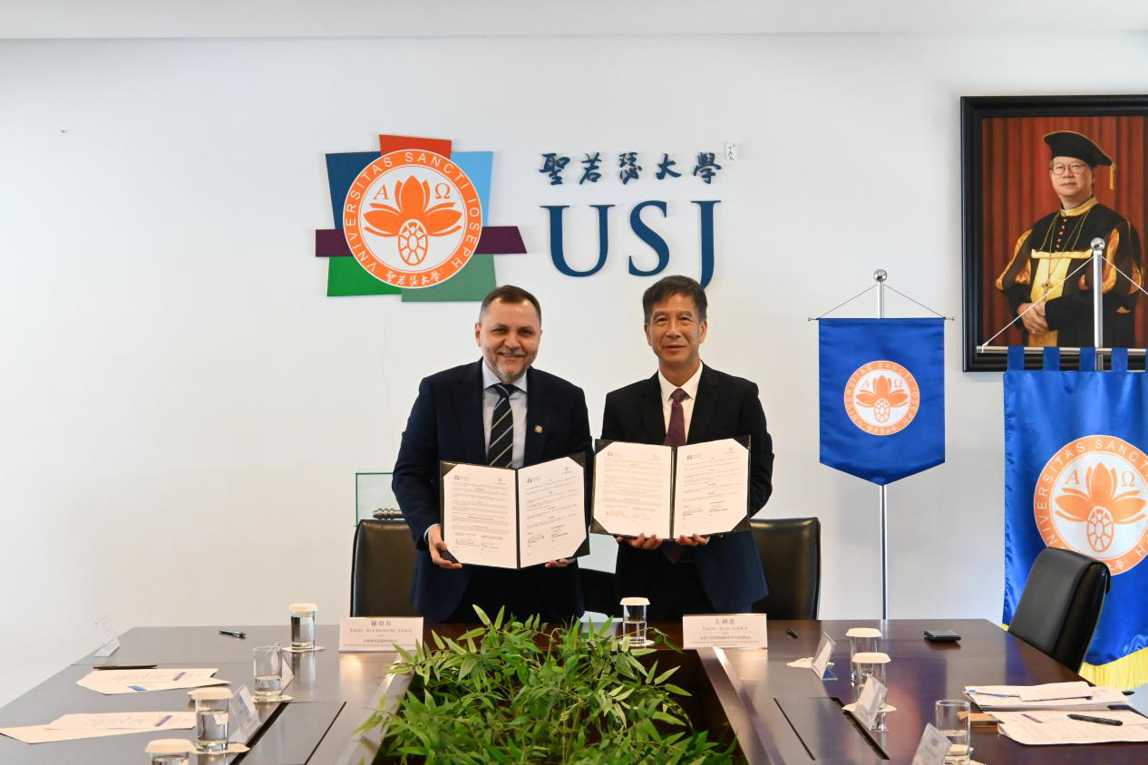 Tsinghua Shenzhen International Graduate School (Tsinghua SIGS) and the University of Saint Joseph (USJ) in Macao signed a memorandum of understanding (MoU) on March 25 during a visit by a Tsinghua SIGS delegation led by Associate Dean Zuo Jian’e.Tsinghua SIGS Associate Dean Zuo Jian’e (R) and USJ Vice Rector Alexandre Lobo sign the MoUThe agreement aims to promote faculty and student exchanges, as well as to strengthen academic interaction and cultural engagement. Both sides will advance collab